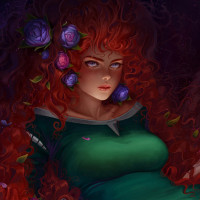 red hair and flowers in her hair, wearing a green dress and holding roses, which is Merida from "Brave." On the right side, there's another character resembling a bear with