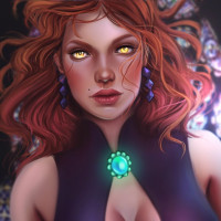 red hair, wearing an outfit that appears to be black and green. She has prominent eyelashes and is looking directly at the viewer with