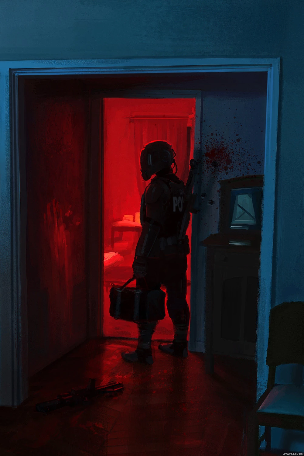 a silhouette of a person wearing a helmet, standing in the doorway of a room with a red glow. It appears to be a stylized or artistic representation rather than a real-life photograph. The details are not clear due to the darkness and the artistic rendering, but it gives off a sense of tension or danger, possibly suggesting a scene from