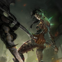 gothic attire that suggests a warrior or mercenary archetype. The background is dark and appears to be the interior of