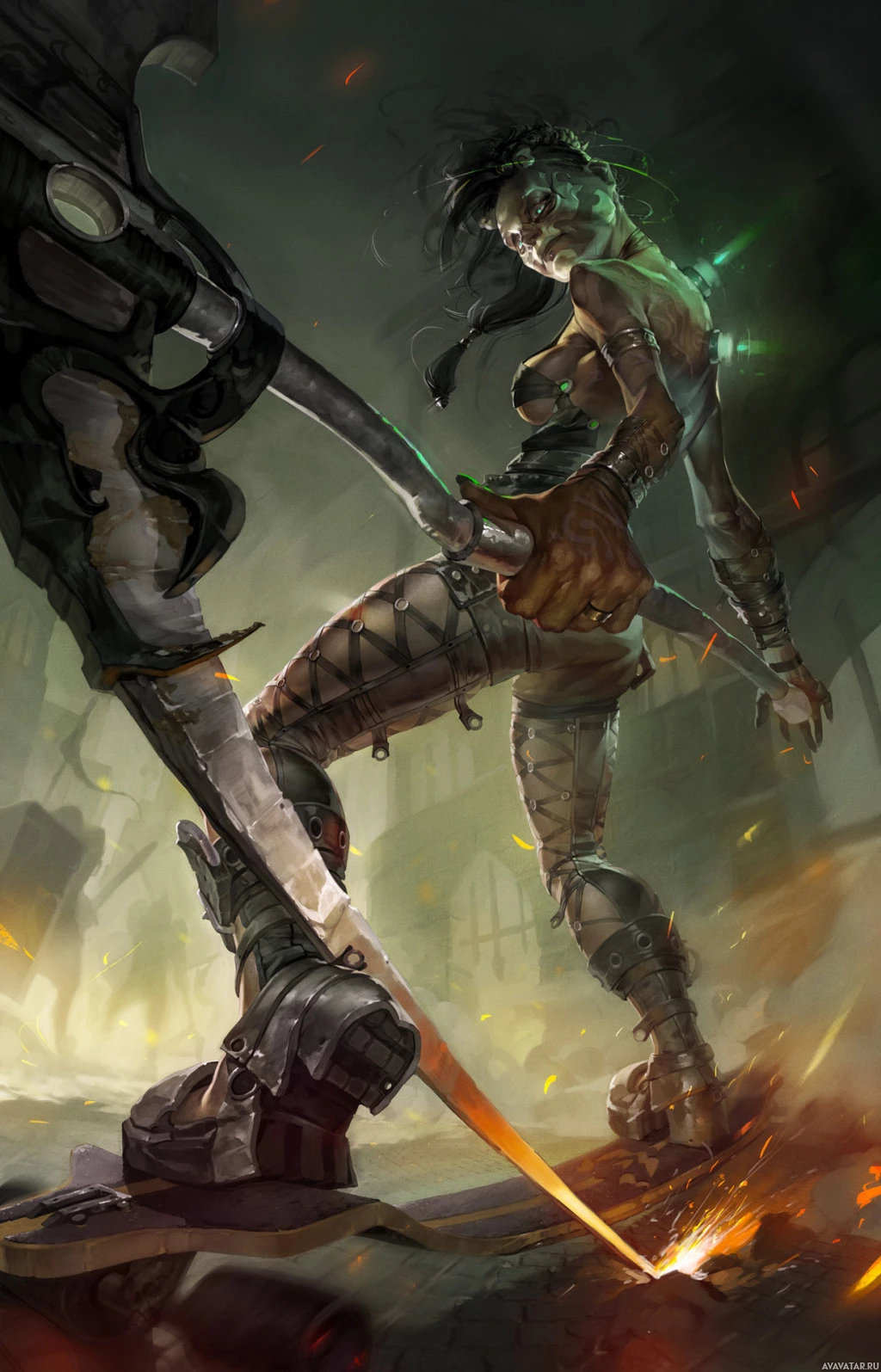 The image depicts a fantasy-themed scene with a character wielding a sword and preparing to strike a robotic or mechanical opponent. The character is dressed in armor with a chainmail skirt, leather corset, and