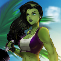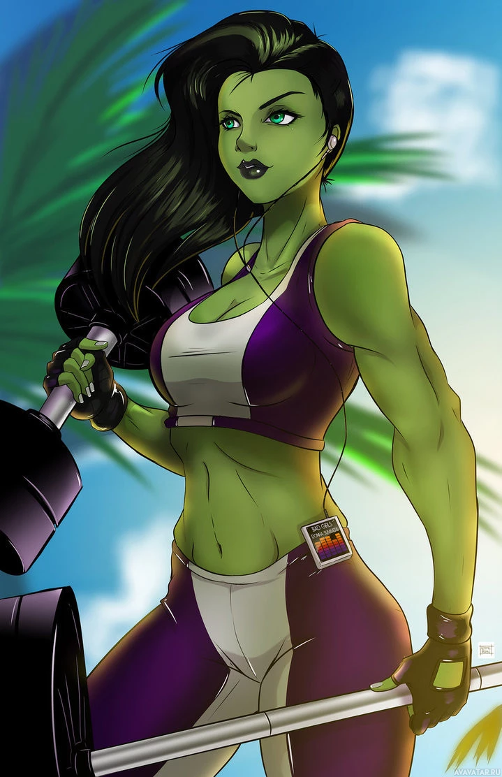 a female character who appears to be inspired by the Hulk, a popular comic book superhero. She has green skin and is wearing purple athletic attire that includes shorts and