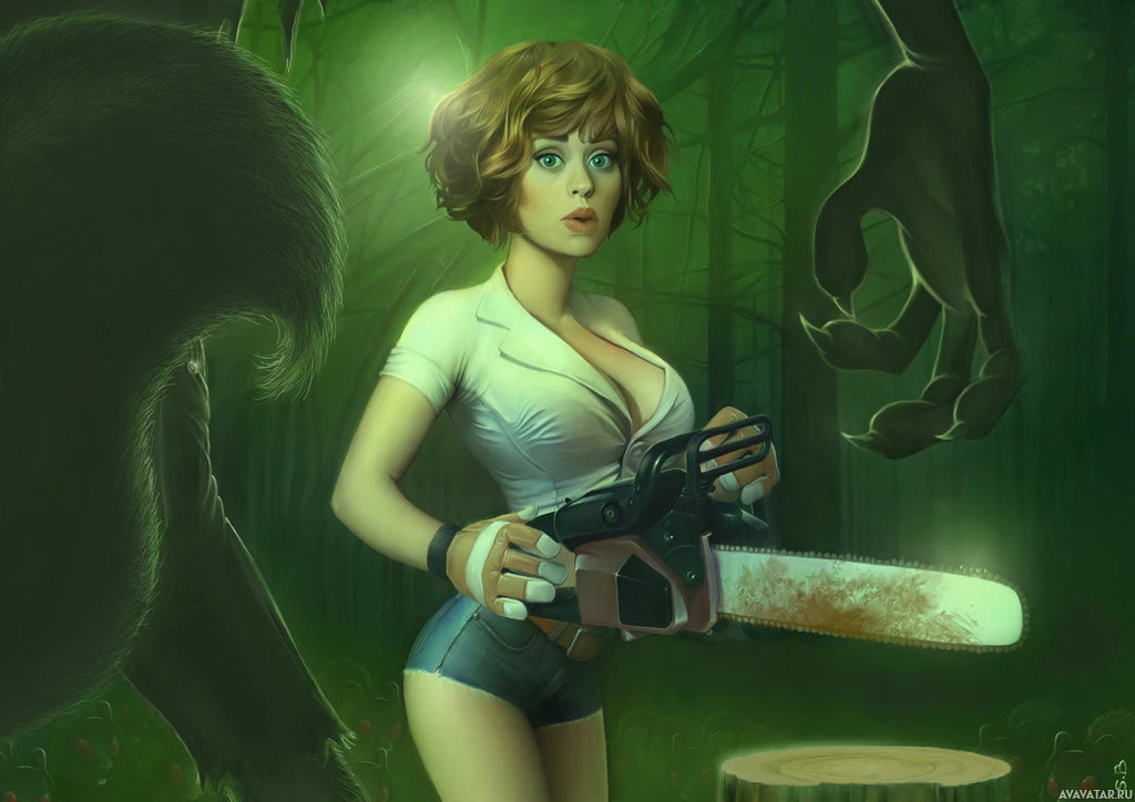 a female character in a forested environment. She is holding what appears to be a chainsaw and seems to be preparing to defend herself from a werewolf that can be seen in the background, growling aggressively. Her attire suggests she might be on some
