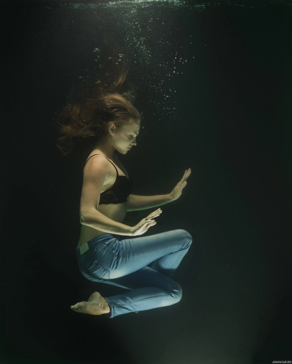 На снимке изображена женщина в воде, которая, кажется, находится под водой или, возможно, носит костюм акваланга с кислородным баллоном. Она сидит скрестив ноги руками, опираясь на бедра. Ее волосы плавают вокруг головы из-за плавучести воды. Окружающая среда предполагает, что она может находиться в контролируемом помещении в бассейне, предназначенном для обучения аквалангу или фотографических съемок.