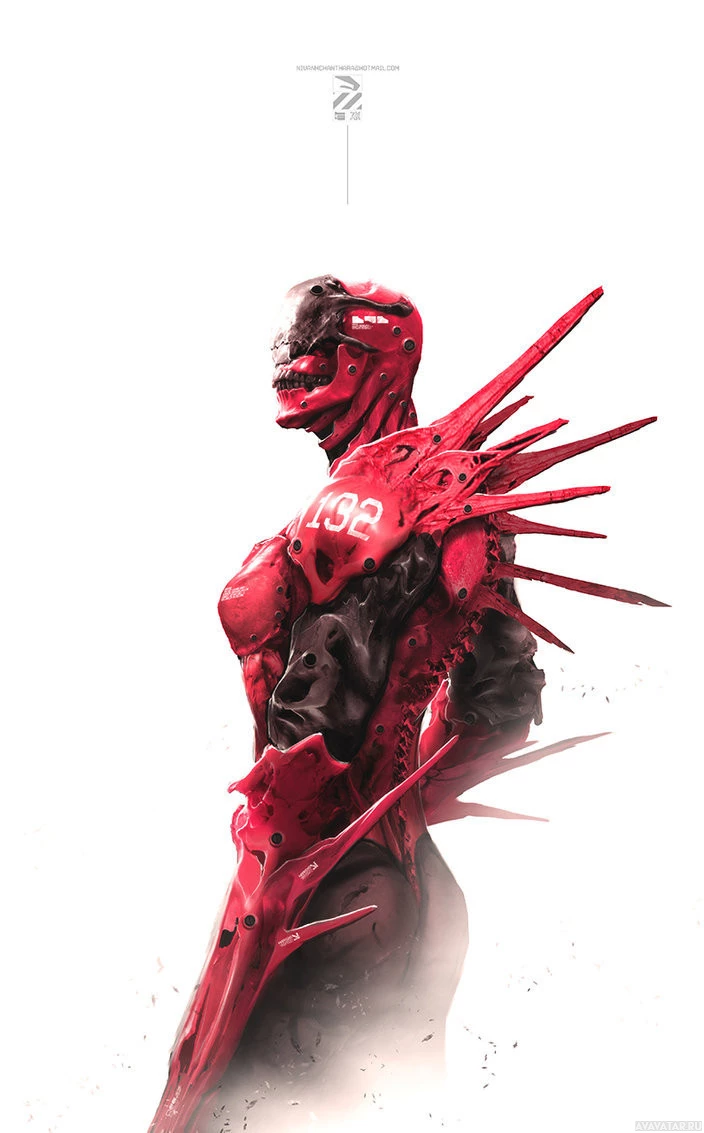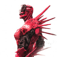 a humanoid robot with spiky, red or dark-colored armor. It has a sleek head design and is depicted in