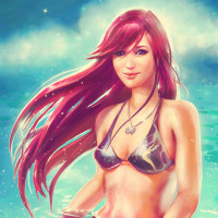 a tank top, and her attire suggests she might be a mermaid or some kind of mythical aquatic creature given the fish tail and scales on her lower body. The character is standing in water, holding what looks like