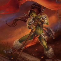 green skin and pointed ears, which are typical features for orcs in the Warcraft series. She is holding a flag with the symbol of a dragon, indicating she may be part of a group associated with dragons or have a connection to them. The character is shown in