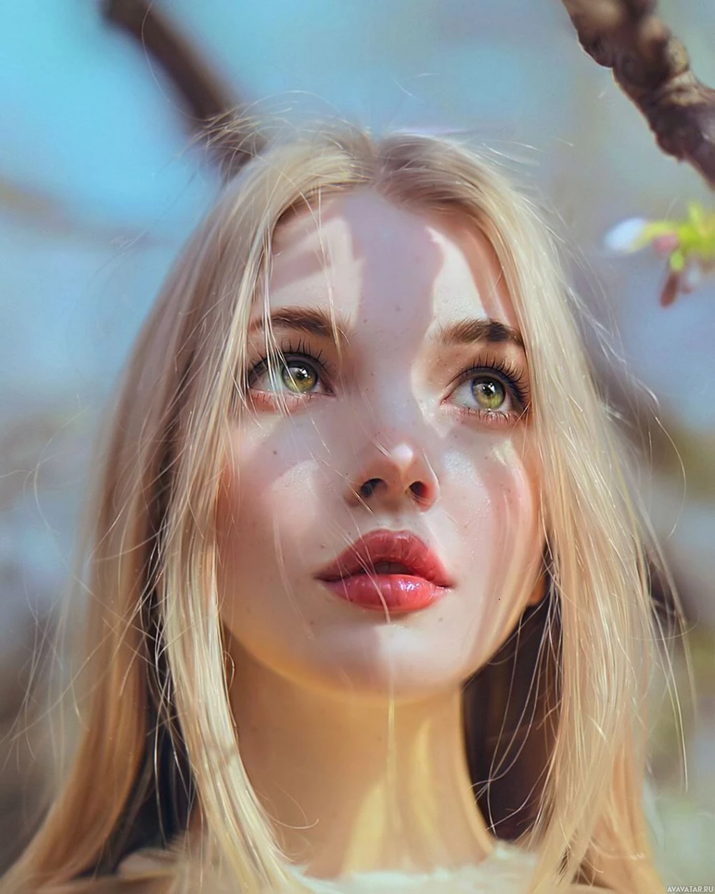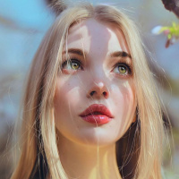 a pattern of light and shadow on her face, which adds to the serene and contemplative mood of the image. Her eyes are slightly squinted against