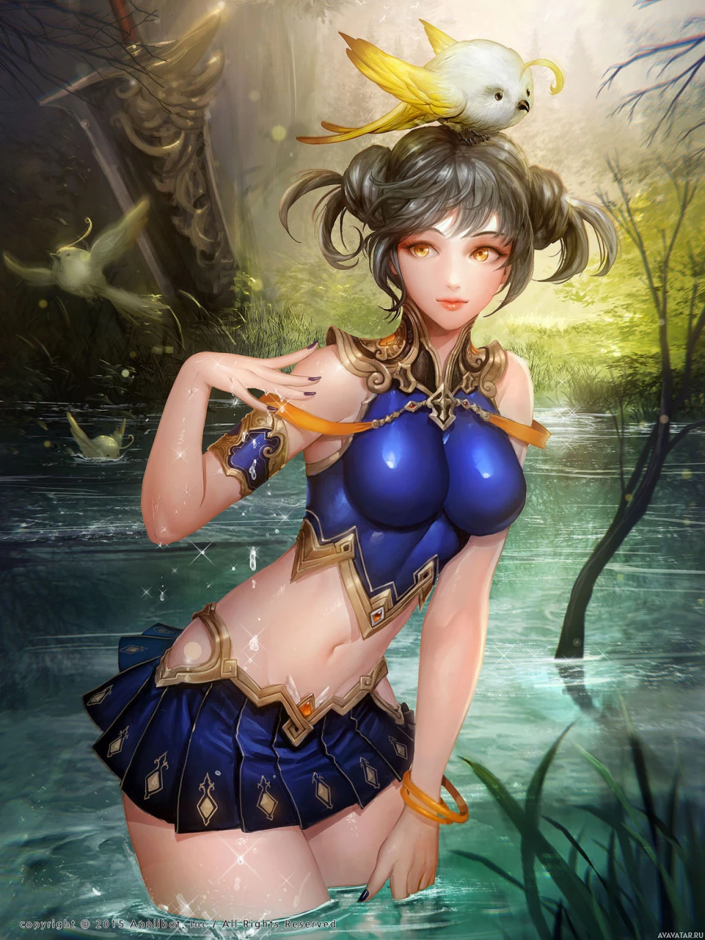 an illustrated character, a female with animal-like features such as ears and wings. She has a bird perched on her head and is wearing armor that suggests she could be a warrior or guardian