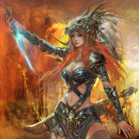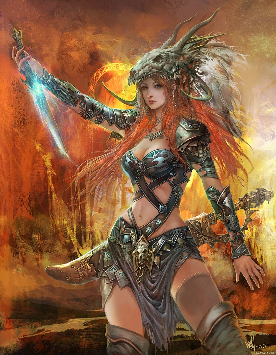 Celtic mythology given the style of armor and adornments. She is a red-haired girl wielding a sword with confidence, set against
