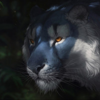 an intense gaze, its eyes reflecting a mix of focus and possibly a hint of sadness or contemplation. It has a thick mane that appears to be a blend of blue and white hues, giving it a majestic appearance. The background features dense vegetation indicative of