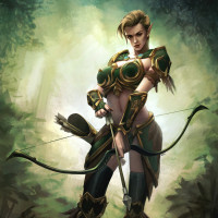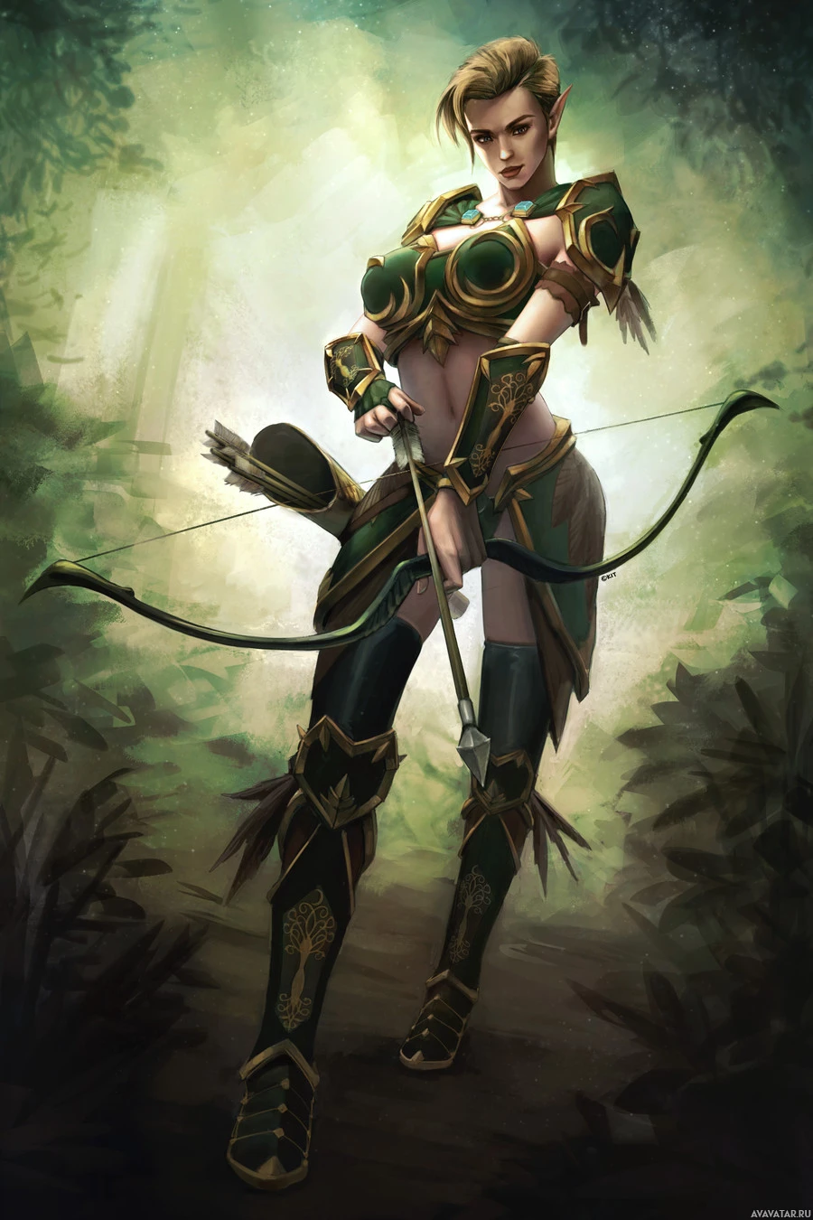 The image depicts a fantasy character who appears to be an elf. The elf is holding a bow and arrow, dressed in armor with a visor that has a high collar, suggesting a role of combat or archery. The setting looks like a forest or wilderness, which aligns with typical fantasy environments where such characters might reside.