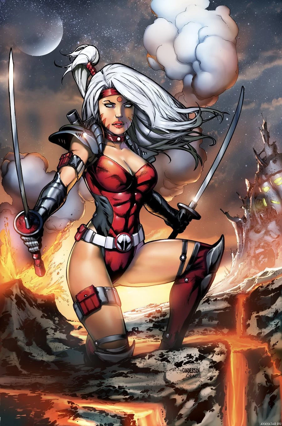 comic books or graphic novels, known for her strength and fighting abilities. The background depicts