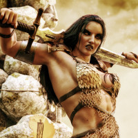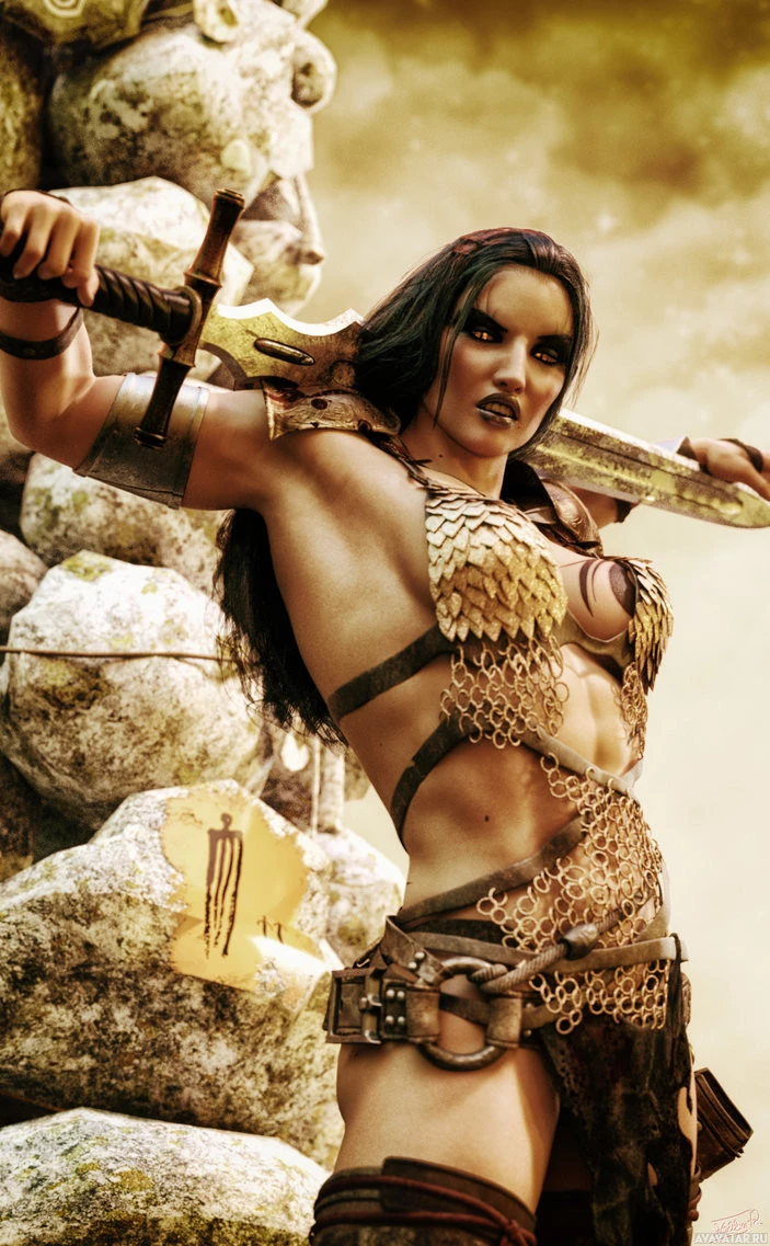 На картинке изображена женщина с темными волосами, держащая меч и носящая доспехи. Она оказывается в боевой позе или готова к бою. Сцена выглядит как фантазия или историческая сцена со скалистыми образованиями на заднем плане.