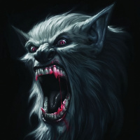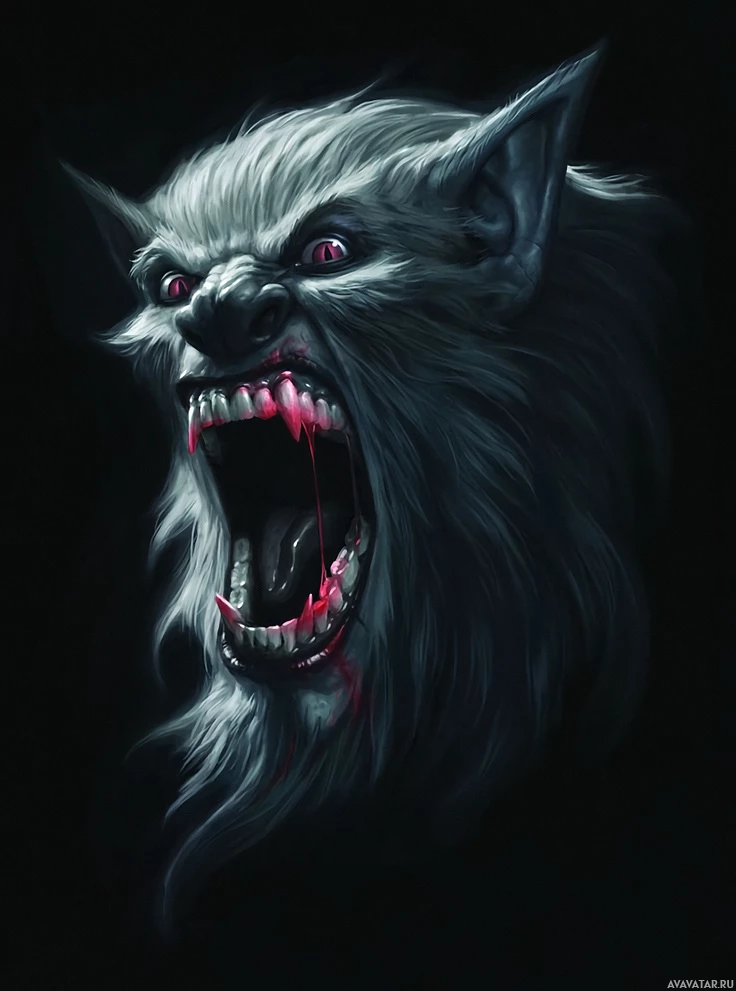 fantasy art, such as sharp teeth, pointed ears, and fur. There appears to be blood dripping from its mouth, adding to the intense and horror-inspired atmosphere.