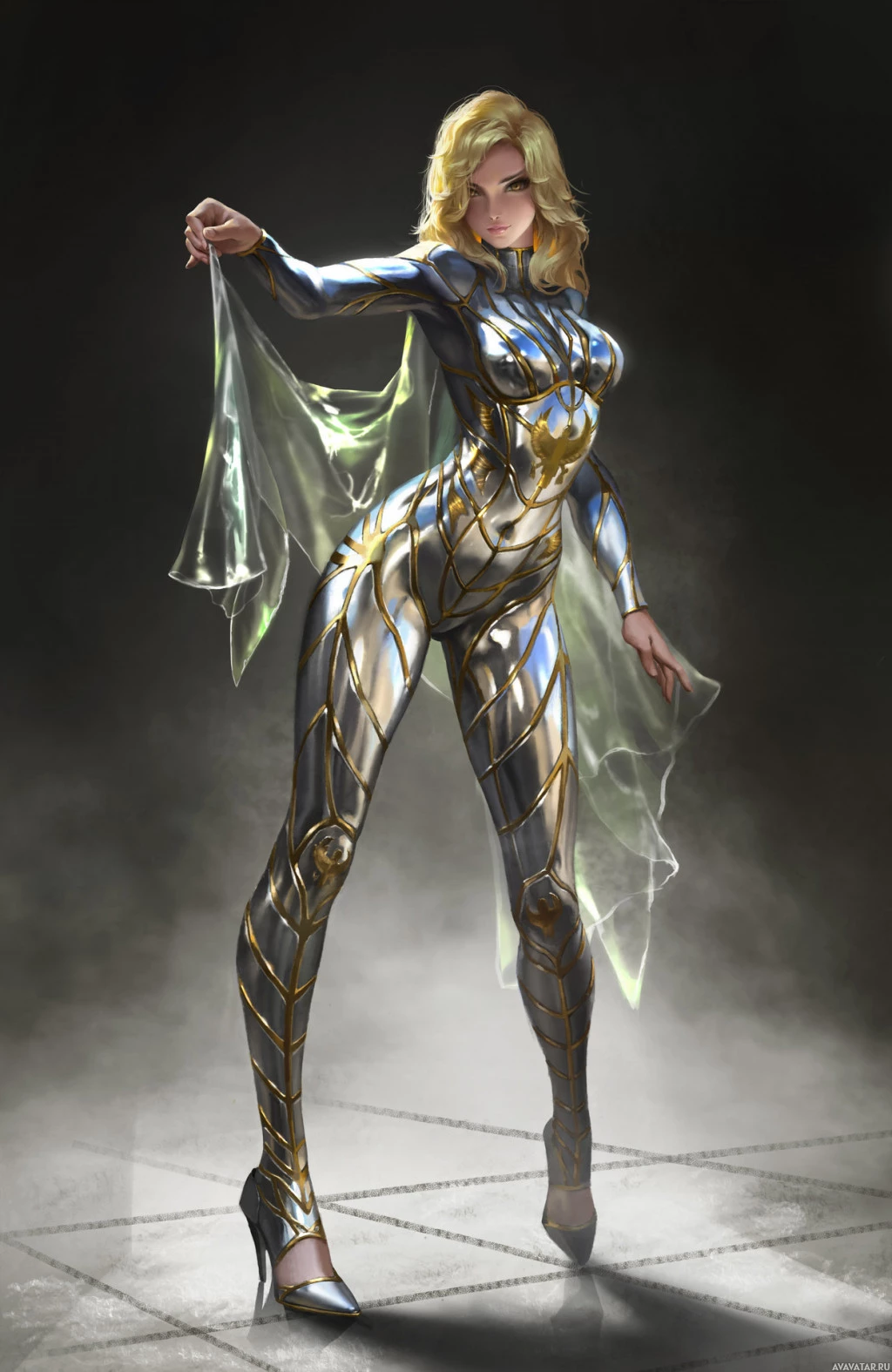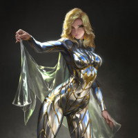 blonde hair and is wearing a costume that resembles an armor made of metallic material, with intricate designs that give it a futuristic or fantasy-like appearance.