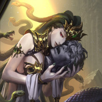 snake locks, and she appears to be interacting with another character who could possibly represent Perseus or another hero from the myth. The setting suggests a mystical or