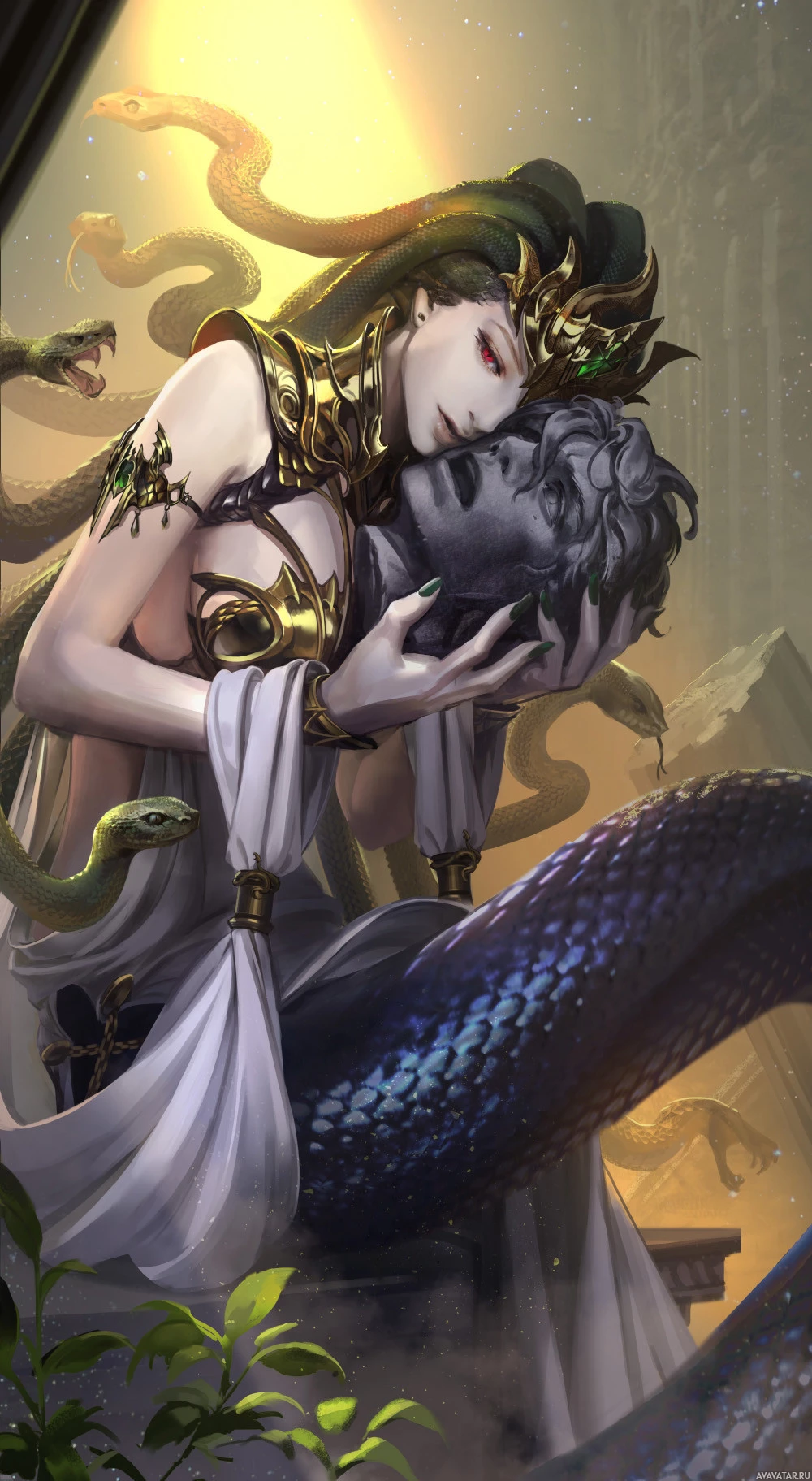 The image depicts a fantasy-themed illustration of Medusa, the Gorgon from