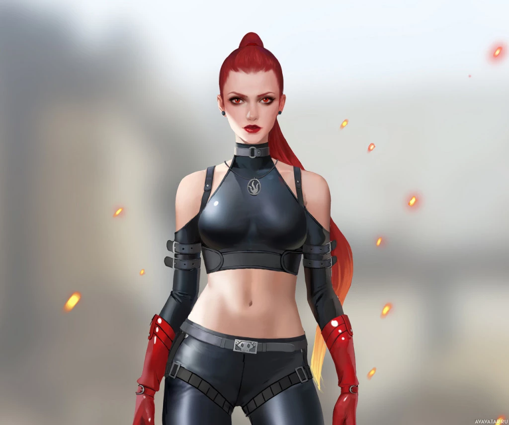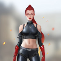 red hair and is wearing a black outfit with some accessories that give her a cyberpunk or futuristic look, such as straps and what appear to be armor pieces. Her expression is neutral or slightly stern, suggesting she might be in