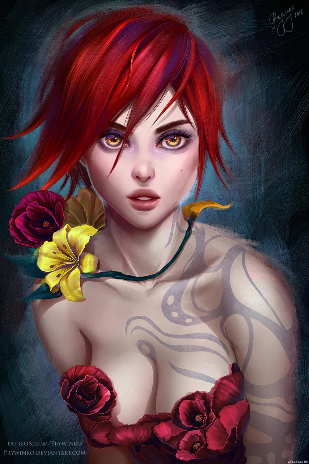 yellow eyes and markings on her face that resemble a mask or tattoos. The character is wearing what appears to be a floral necklace around her neck and is adorned with