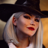 the video game Overwatch. This individual is wearing a black cowboy hat and has a striking appearance with