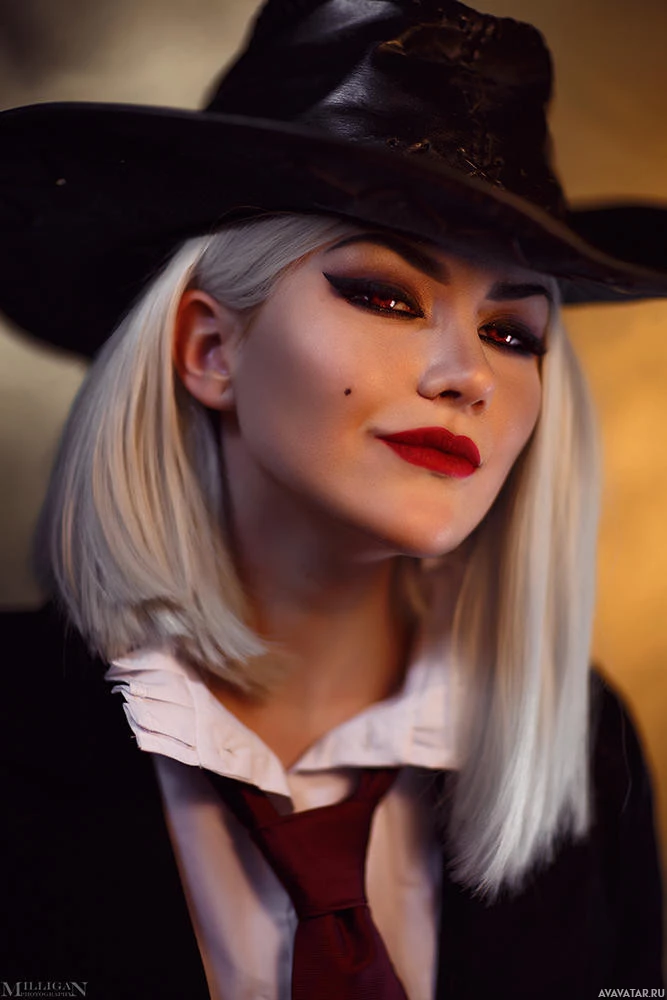 white hair, red lips, and dark eye makeup. They are also sporting a costume that includes elements of Ashe's