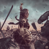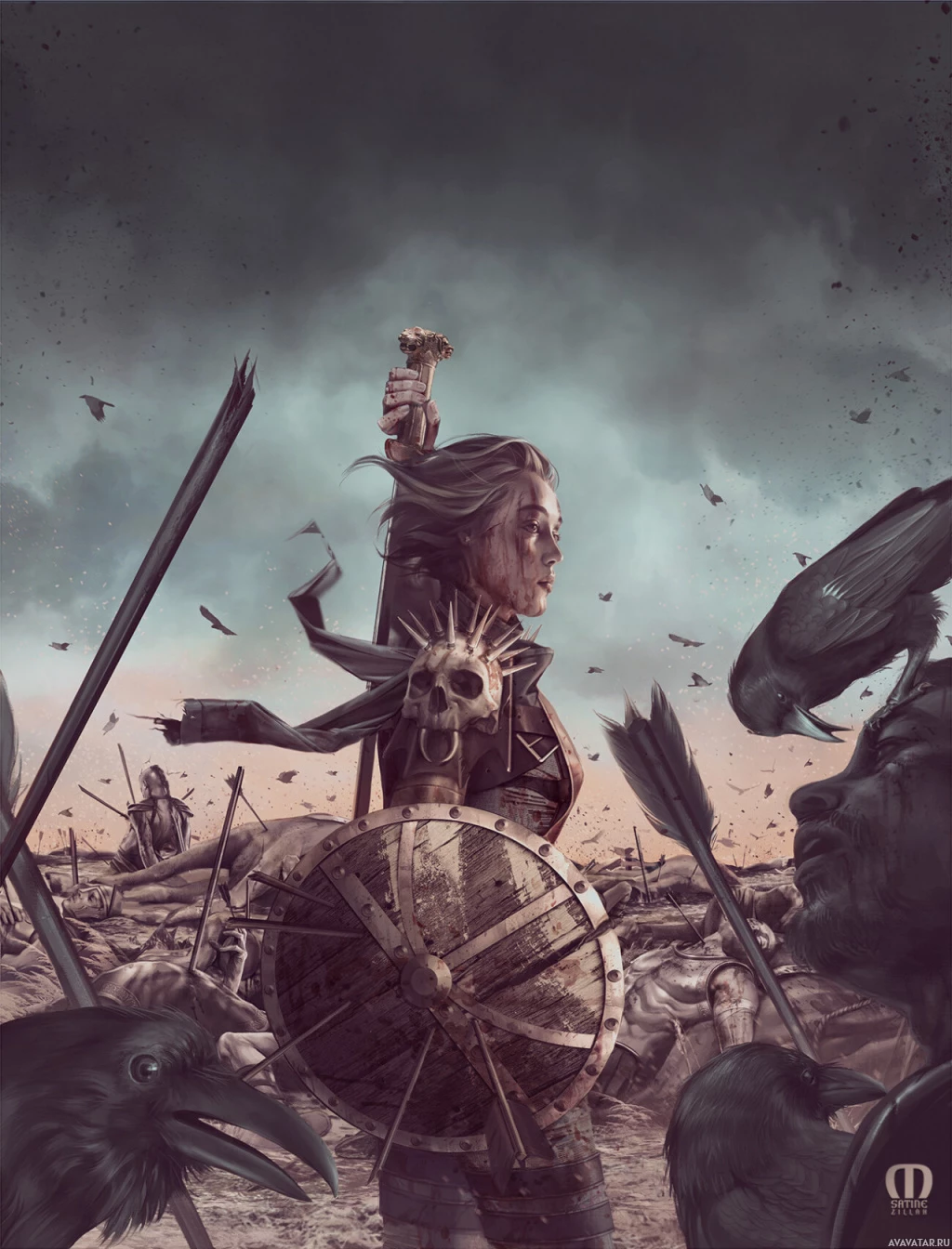 a warrior woman standing amidst a battlefield. She is wearing armor and holding a shield, suggesting she is prepared for combat. There are