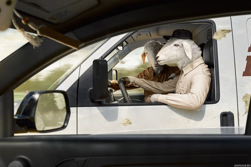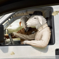 The image shows a scene where a sheep is dressed in