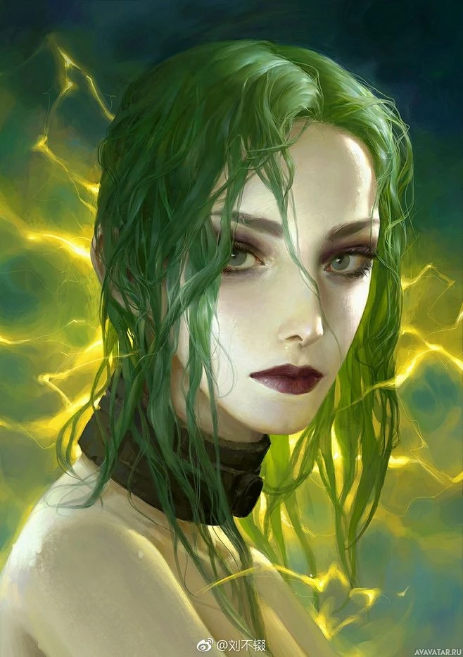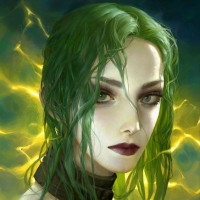 a female character with green hair and what appears to be an electric or magical theme around her. She has