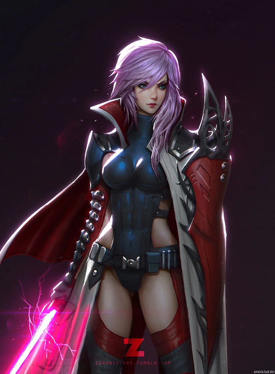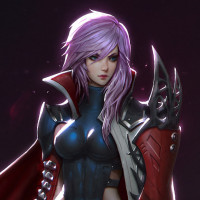 purple hair and is wearing armor with red accents, suggesting she might be a warrior or a fighter in her narrative context. Her attire includes a cape that seems to have a metallic appearance. The background appears to be dark and has a sci-fi vibe, which could indicate that this character is part of