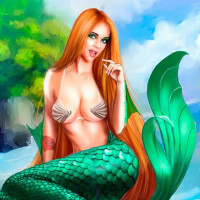На данной картинке изображен фантастический персонаж, который кажется русалкой. У нее рыжие волосы и она сидит на камнях возле воды, носит хвост русалки с чешуей. Обстановка, кажется, находится на открытом воздухе в дневное время, о чем свидетельствует наличие облаков в небе.