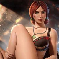 the video game "The Witcher 3: Wild Hunt." She is depicted in an alternative art style, wearing lingerie and sitting on a chair. Her posture suggests she's confidently posing for the viewer. This character is known as Triss Merigold, who is portrayed with