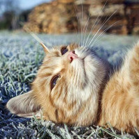 The picture shows a cat laying on the ground. It appears to be outdoors, with grass covered in frost or ice, suggesting it might be