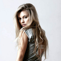 blonde hair, and she is wearing what appears to be a gray or silver top that has a somewhat low neckline. Her left hand is placed on her hip, and her right hand is holding onto her outfit at the waist. Her pose suggests confidence and poise. The background is neutral and does not distract from the subject.