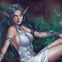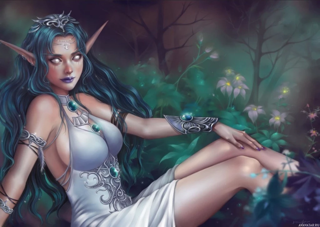 dark hair and pointed ears characteristic of elves in many fantasy traditions. The character is wearing