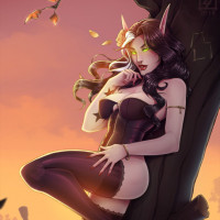 an illustrated character who appears to be a fantasy-style elf. She is depicted in a sexy or seductive pose, leaning against