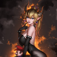 a female character who has been transformed or combined with elements from other characters, which is commonly referred to as "bowsette." The character features the hair and ear-like horns of Bowser from the Super Mario series, along with the attire and overall style associated with