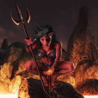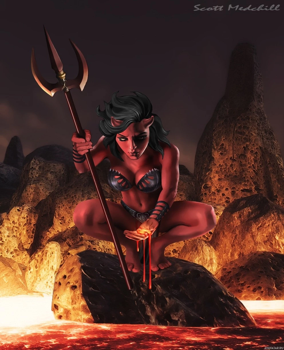 The image depicts a fantasy-themed illustration of a character who appears to be a demon. She is crouched on what looks like molten lava, holding a staff with an emblem that resembles the Trident of Poseidon from
