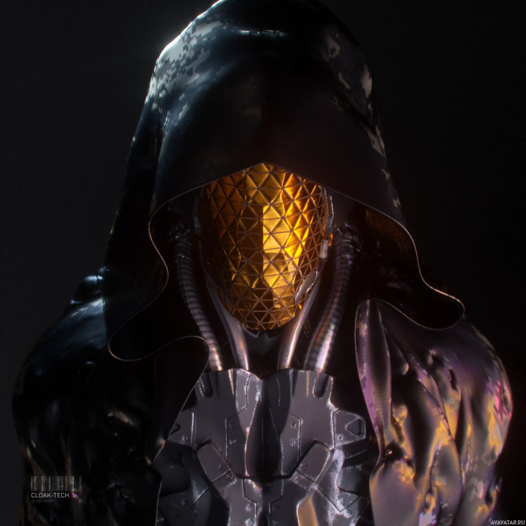 a black hood and a mask with what appears to be a glowing or reflective yellow or gold design. The character is also wearing a garment that has mechanical elements, suggesting a futuristic or science fiction theme. There are visible cables or tubes connecting the mask to the upper body of the suit, indicating some form of