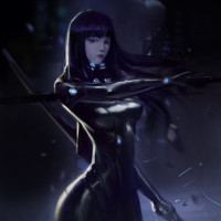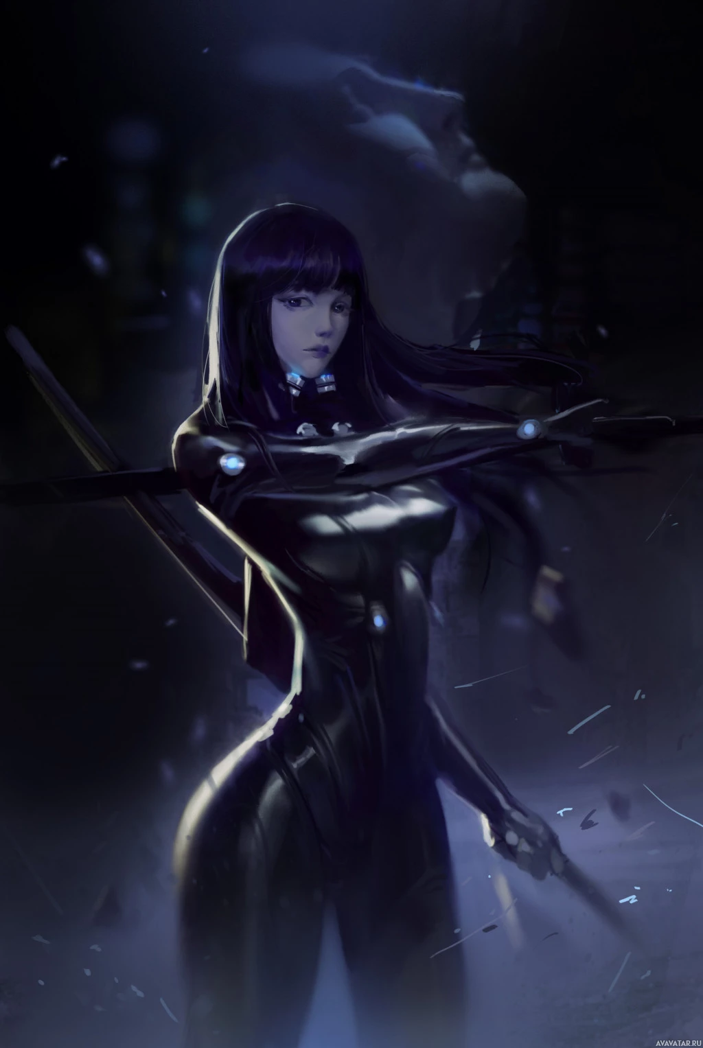 a tactical suit, commonly associated with the "Ghost in the Shell" series, which is a popular Japanese media franchise known for its cyber-themed narratives and characters. The character is standing against
