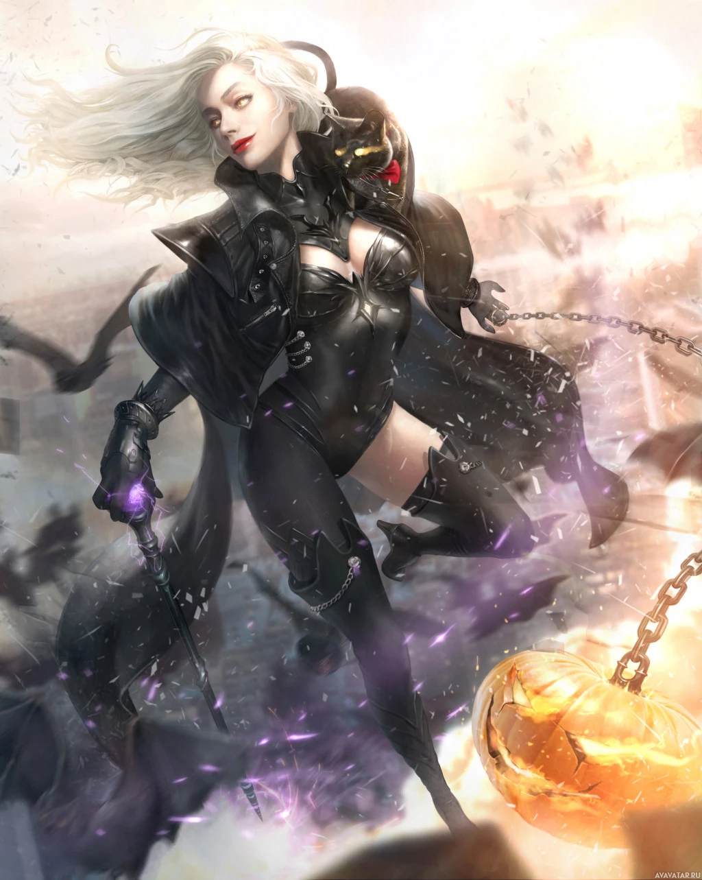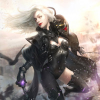 blonde hair and is wearing armor with a dark, gothic style. In one hand, she holds a staff or rod that emits light or energy, while the other hand is holding what appears to be an orb. Her expression is intense and focused, suggesting action or combat readiness. The background features elements such as ruins and destruction, implying