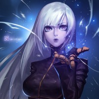 female character with white hair. She appears to be in