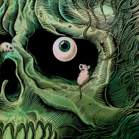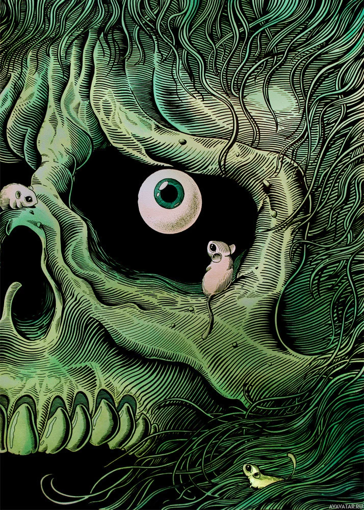 a skeletal hand in the foreground, holding what appears to be a mouse. The image has a whimsical or fantasy-like quality due to its design and colors. There's no indication that this depicts a real scene; it seems to be an artistic representation of