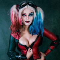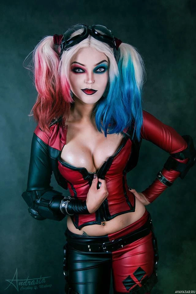 the iconic look and is wearing makeup that accentuates the character's features such as the pale skin, bold lipstick, and smoky eyes. They are also holding a bat, which is consistent with Harley Quinn's