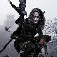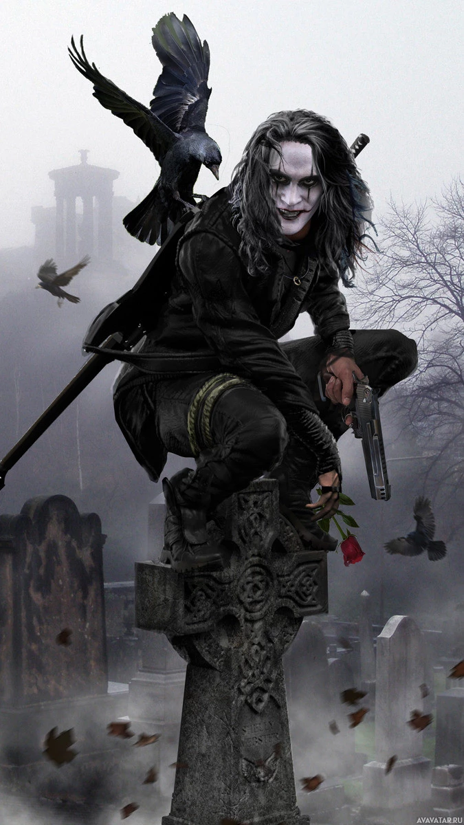 a black suit and is holding a pistol. Surrounding the character are crows, which adds to the Gothic or eerie atmosphere of the scene. The background suggests a graveyard with tombstones and