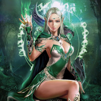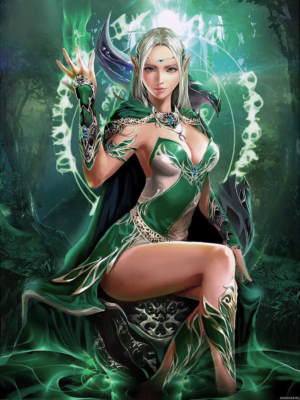 white hair, pointed ears, and wearing fantasy armor with a green color scheme. The setting appears to be magical or mystical, with glowing