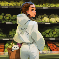 На картинке изображена иллюстрированная сцена с девушкой, стоящей перед полкой продуктового магазина, заполненной различными овощами. Она одета в белую толстовку и джинсы, и она, кажется, носит коричневый мешок на руке и держит кошку в одной руке. На заднем плане показаны другие продукты, предполагая, что это изображение захватывает момент внутри супермаркета или продуктового магазина.