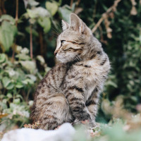 a garden setting. The kitten is looking towards the camera, and it has a curious or attentive expression on its face. Behind the kitten are green plants, indicating