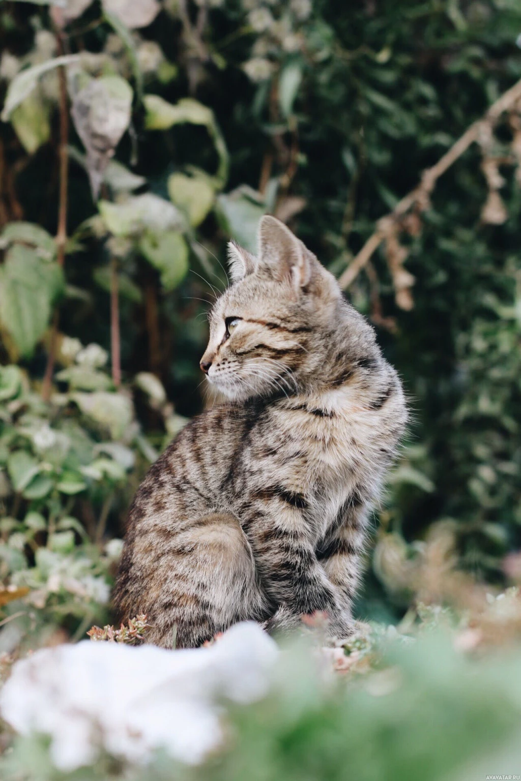 an outdoor environment that could be a backyard or wild area where the kitten might be exploring or hiding.