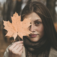 На картинке изображен человек, держащий осенний лист возле лица, с листом, покрывающим один глаз. Человек носит шарф и, кажется, находится на открытом воздухе, что выглядит так, как будто это может быть осенью, учитывая наличие опавших листьев на земле.